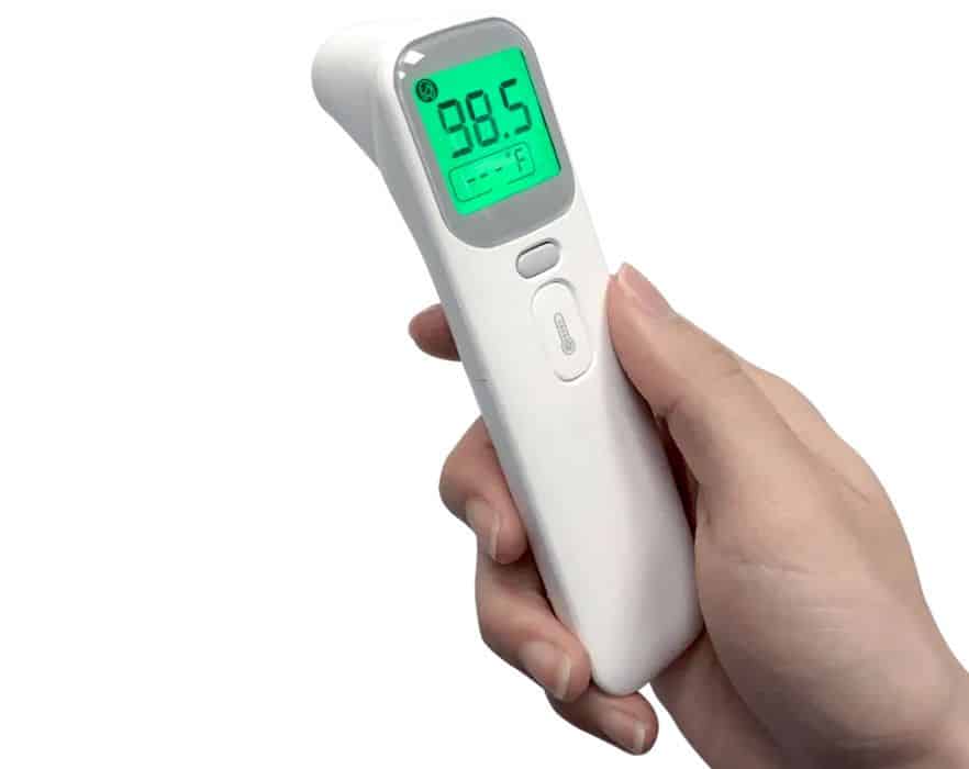 - A completely non-contact thermometer. Hold it a couple of inches from the forehead to take a temperature.