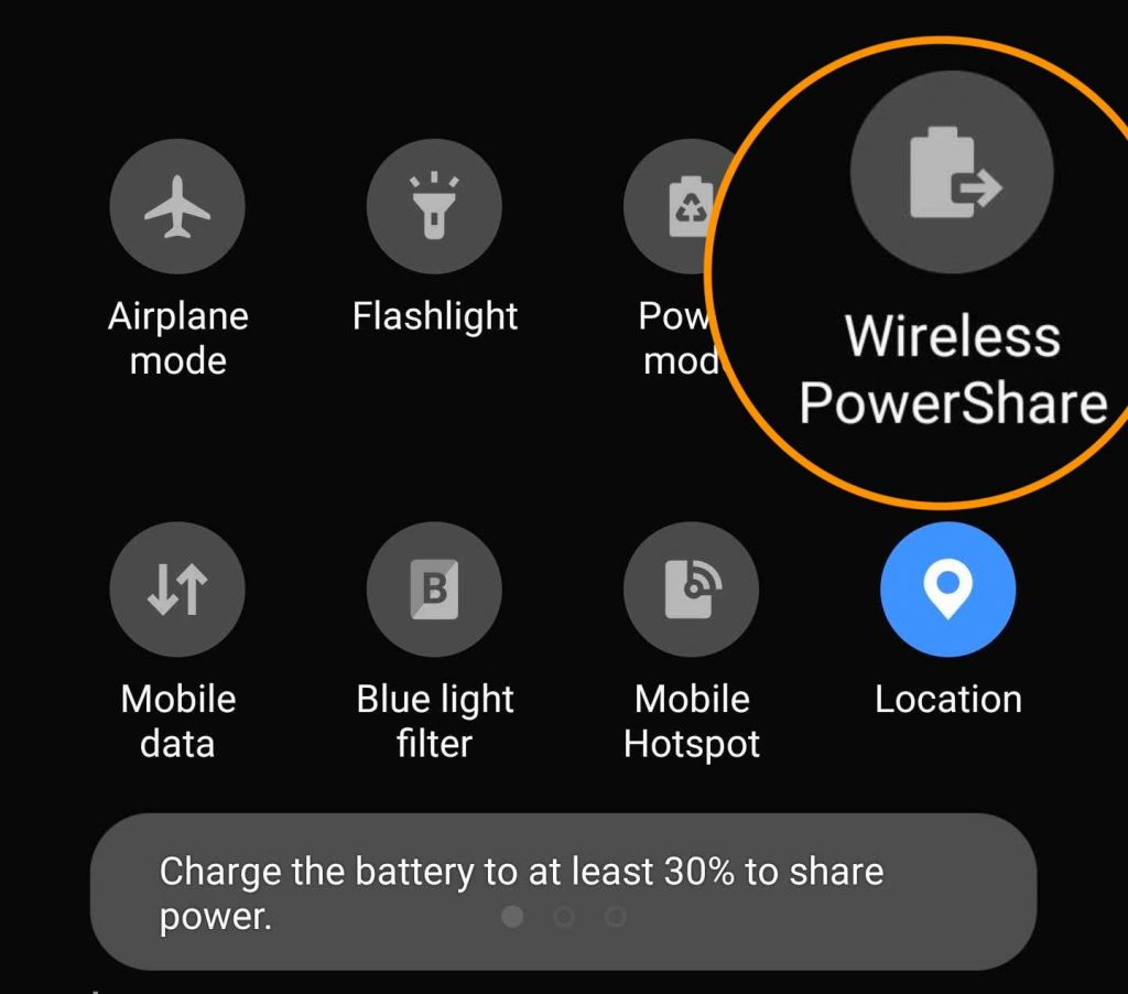 - Open your phone’s Quick Settings and tap the Wireless PowerShare icon. If you don’t see it, choose the More button (the three vertical dots,) tap Edit, and see if it’s hidden.