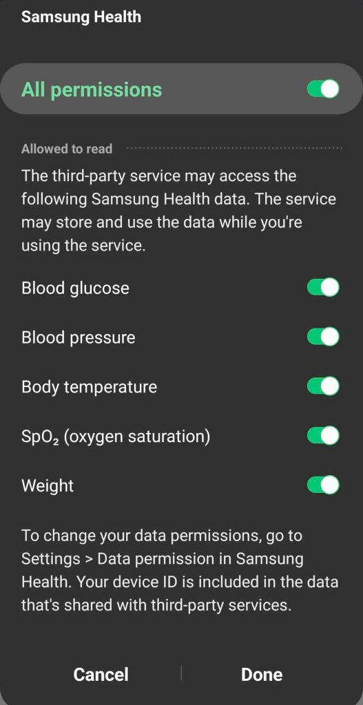 - Toggle on All permissions or make sure you turn on the Blood Pressure, SpO2, and Weight options under the Allowed to read section.