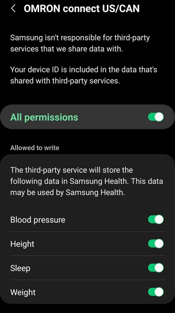 - Toggle on All permissions or make sure you turn on both the Blood Pressure and Weight options under the Allowed to write section.