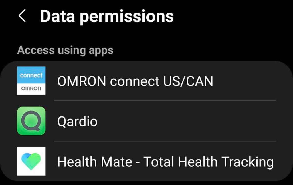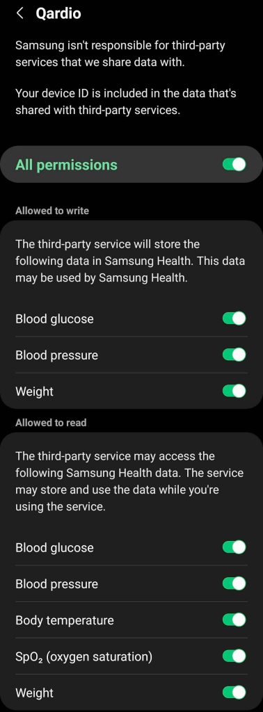 - Follow any additional prompts that allow Qardio to share and store data in Samsung Health.