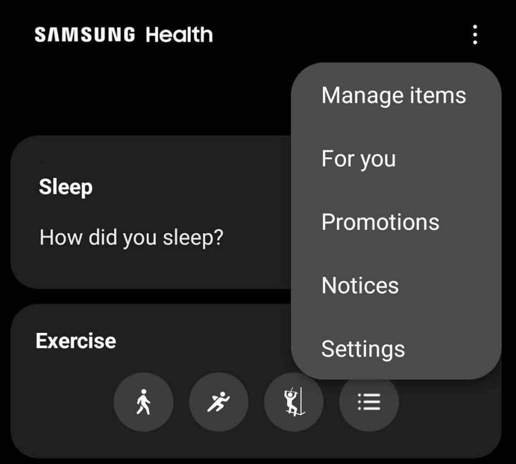 - Open the Samsung Health app and then tap More options (the three vertical dots.)