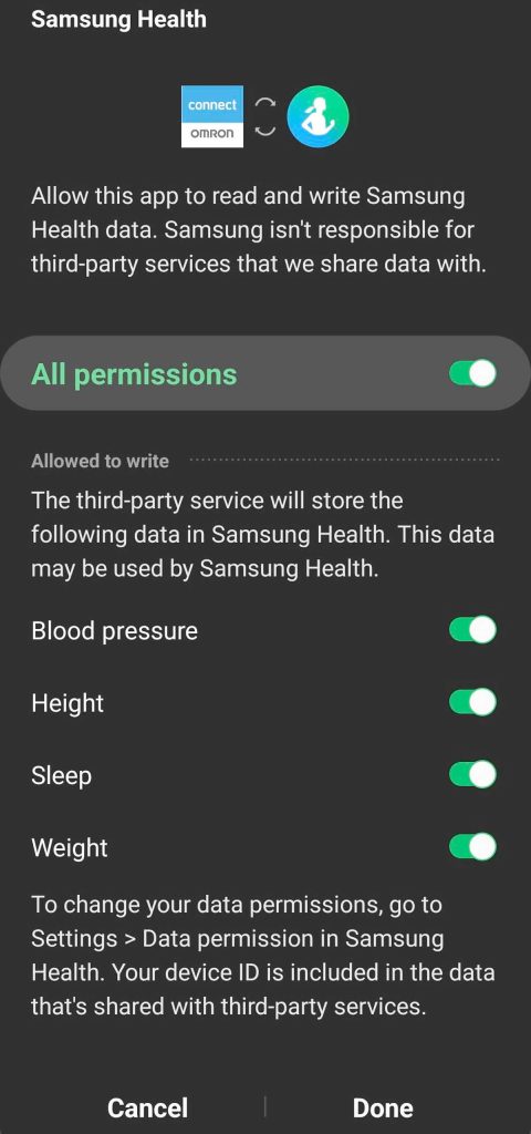 - Choose All permissions or choose the categories you want to share between Connect and Samsung Health–make sure you select Blood pressure and Weight.