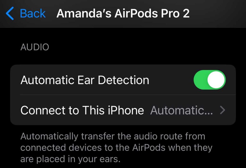 - Open the AirPods settings on your phone (Settings > AirPods) and take a look under the Audio section. Ensure you toggle on Automatic Ear Detection and set Connect to This iPhone to Automatically.