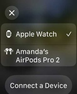 So if your AirPods aren’t automatically connecting to your watch like they should, tap open Control Center and try using the AirPlay option to switch your audio output to your AirPods.