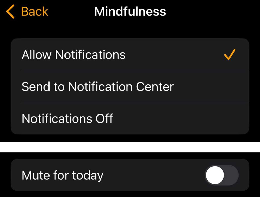- In the Watch app on your iPhone, open Notifications and make sure you allow the Mindfulness app to send notifications. Scroll further down, and verify that Mute for Today is also off.