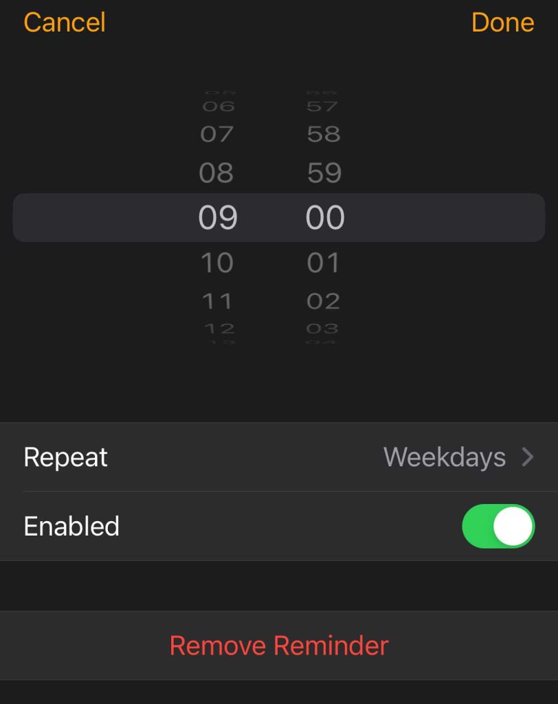 - Toggle off Enabled to suspend the reminder temporarily. You can then turn it back later.