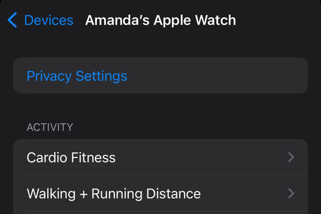 - Go through the list and locate and tap your current Apple Watch. Your current watch shows you active options, including active Privacy Settings and options to see data for activity, hearing, heart, mobility, respiratory, sleep, and vitals.
