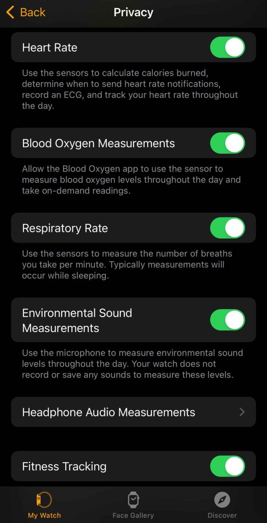 - Verify that all toggles are turned on, including heart rate, blood oxygen measurements, respiratory rate, environmental sound measurements, and fitness tracking.