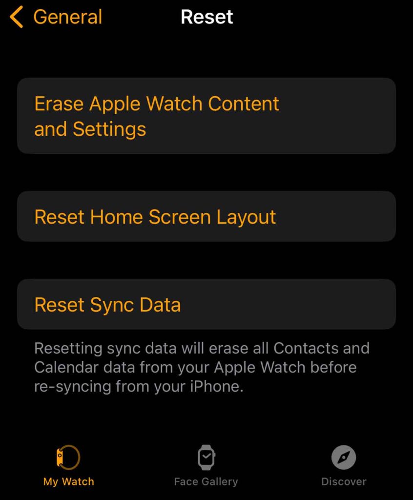 - Tap Reset Sync Data. It may seem like tapping this button does nothing. But it works in the background to erase all contacts (and calendars) from your watch and then re-syncs with your iPhone. This process could take up to 30 minutes to complete.
