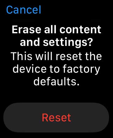 - For watchOS 9 and below, wait a few seconds, then press and hold the side button for 20 seconds. Wait for the Erase all content and settings screen, then tap Reset.