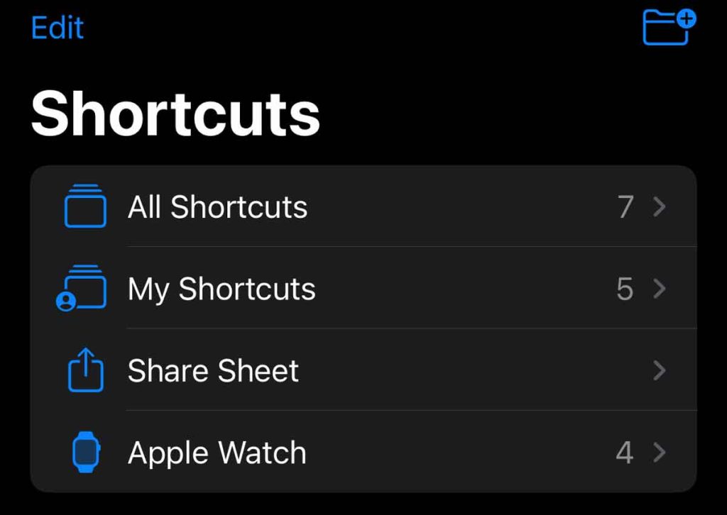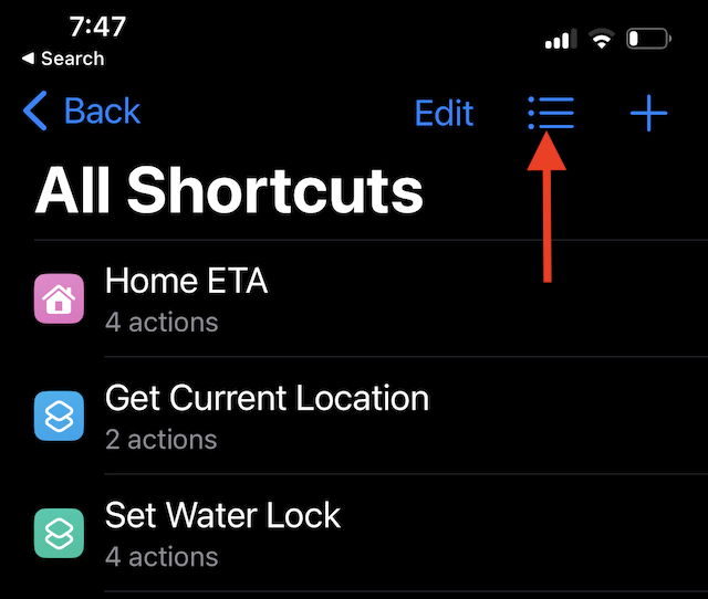 To see all the shortcuts you added to your Apple Watch, tap Shortcuts in the upper-left corner of the Shortcuts app on your iOS or iPadOS device, then tap Apple Watch from the top list.