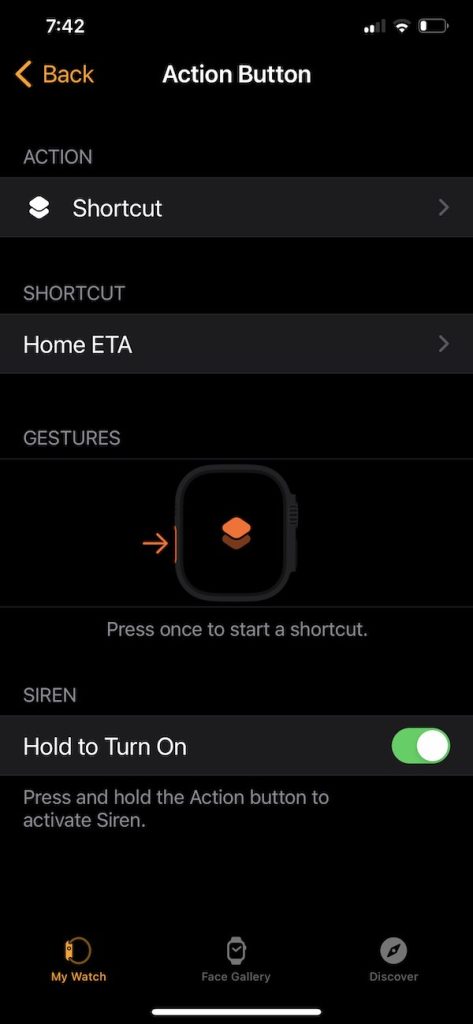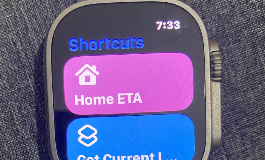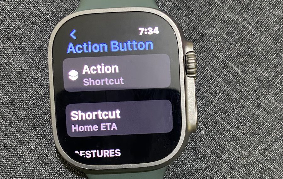 The sequence of steps above syncs the Shortcuts you toggled on for Apple Watch from your iPhone. If you press the Action Button, it fires the Shortcut Home ETA.