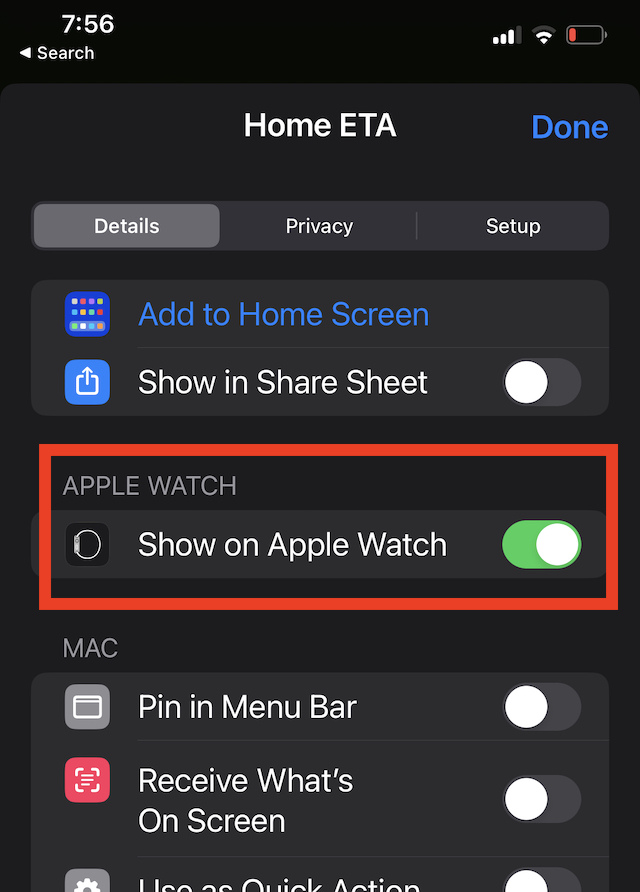 To troubleshoot this issue, check the Shortcut first on your iPhone to confirm if it has been marked for Apple Watch.