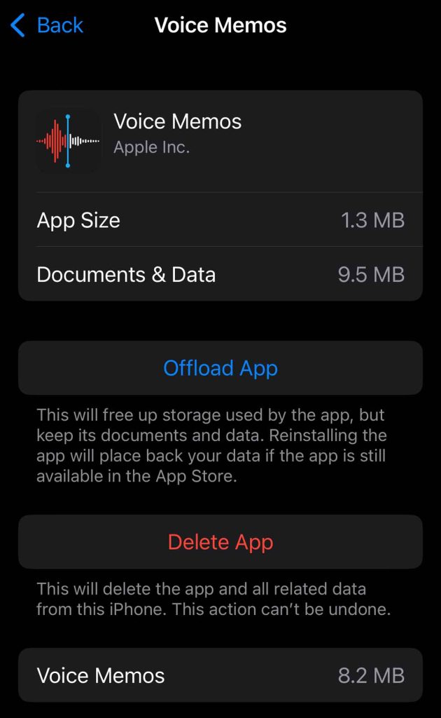 Sometimes a fresh installation of the app does the trick. The first thing we’re going to try is offloading the Voice Memos app from your iPhone.