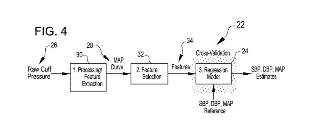 The patent highlights the use of different algorithms to combine the various data points to calculate the user’s correct blood pressure.