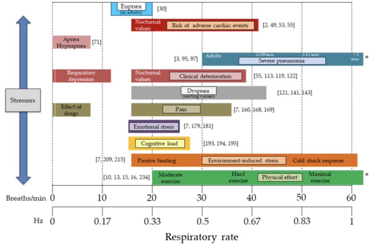 Respiratory rate is a fundamental vital sign that is sensitive to different pathological conditions (e.g., adverse cardiac events, pneumonia, and clinical deterioration) and stressors, including emotional stress, cognitive load, heat, cold, physical effort, and exercise-induced fatigue.