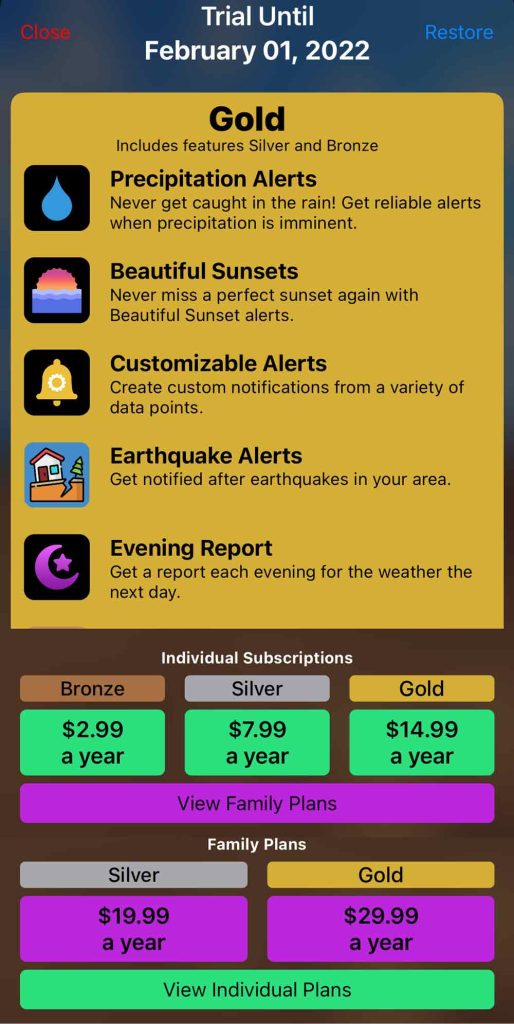 Weather Live also offers an additional subscription you can purchase, but it is unnecessary. Their subscription includes more detailed forecasts, additional weather stats, and personalization features.