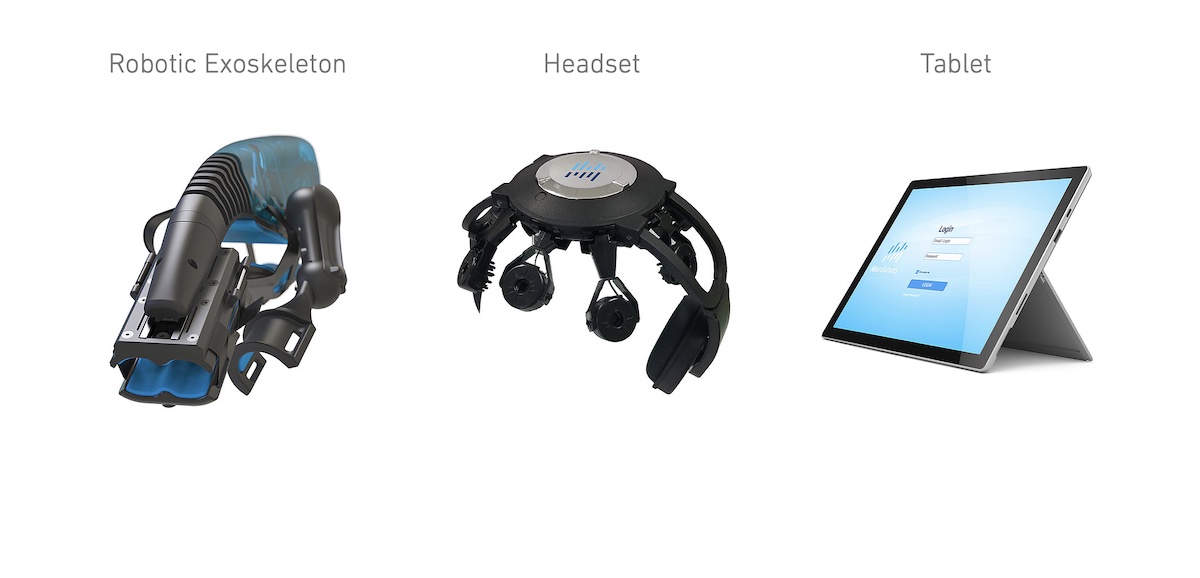 The Neurolutions platform consists of a wireless EEG electrode device worn on the head that is used to measure the patient’s brain signals; these signals are analyzed by the system to determine the patient’s intent to move their affected hand and translates the signals into motor movement of the robotic skeleton, resulting in opening and closing of the impaired hand.