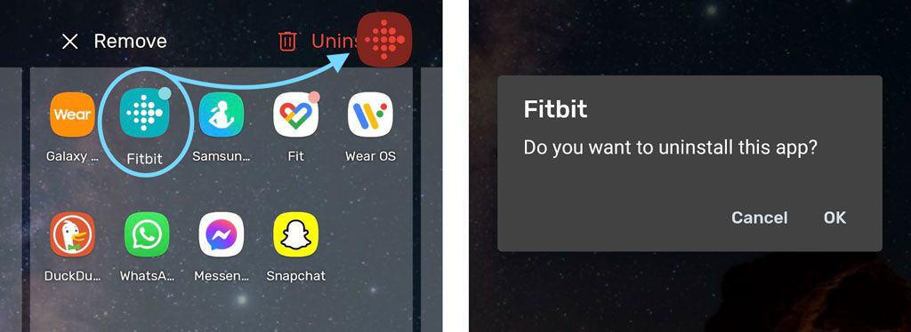 - For Android devices, touch and hold the Fitbit app icon and move it slightly until you see Remove or Uninstall options at the top of your screen. Drag the Fitbit app to Uninstall and confirm you want to delete it.