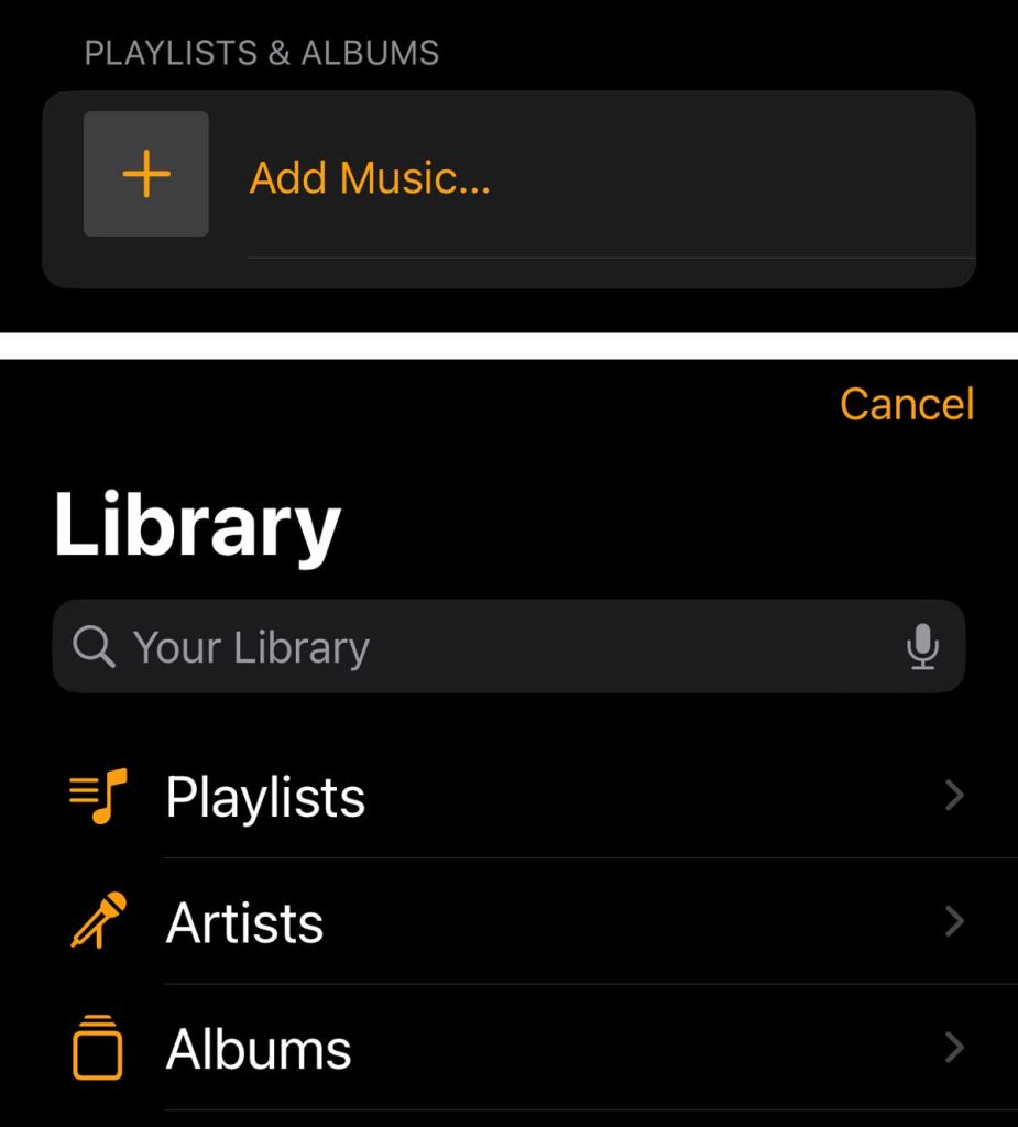- Tap on Add Music from under PLAYLISTS & ALBUMS.