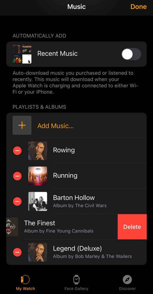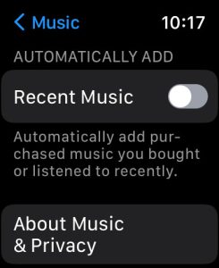 - We also recommend toggling off Recent Music so it’s not automatically added to your watch.