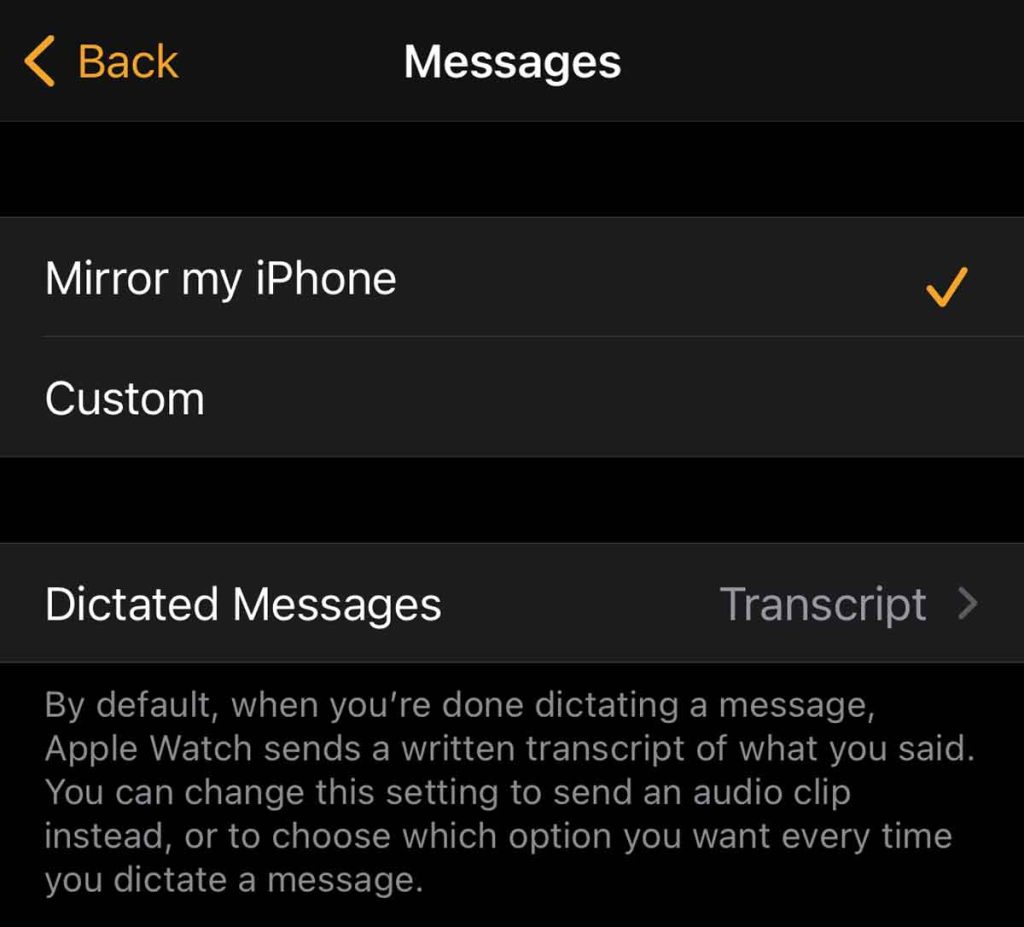 Your watch’s default Message app setting for a dictated message is to send it as text, not as audio. So if you want to send your dictated messages as audio clips OR want the option to send them as audio clips or typed messages, you need to change the default setting for when you dictate a message.