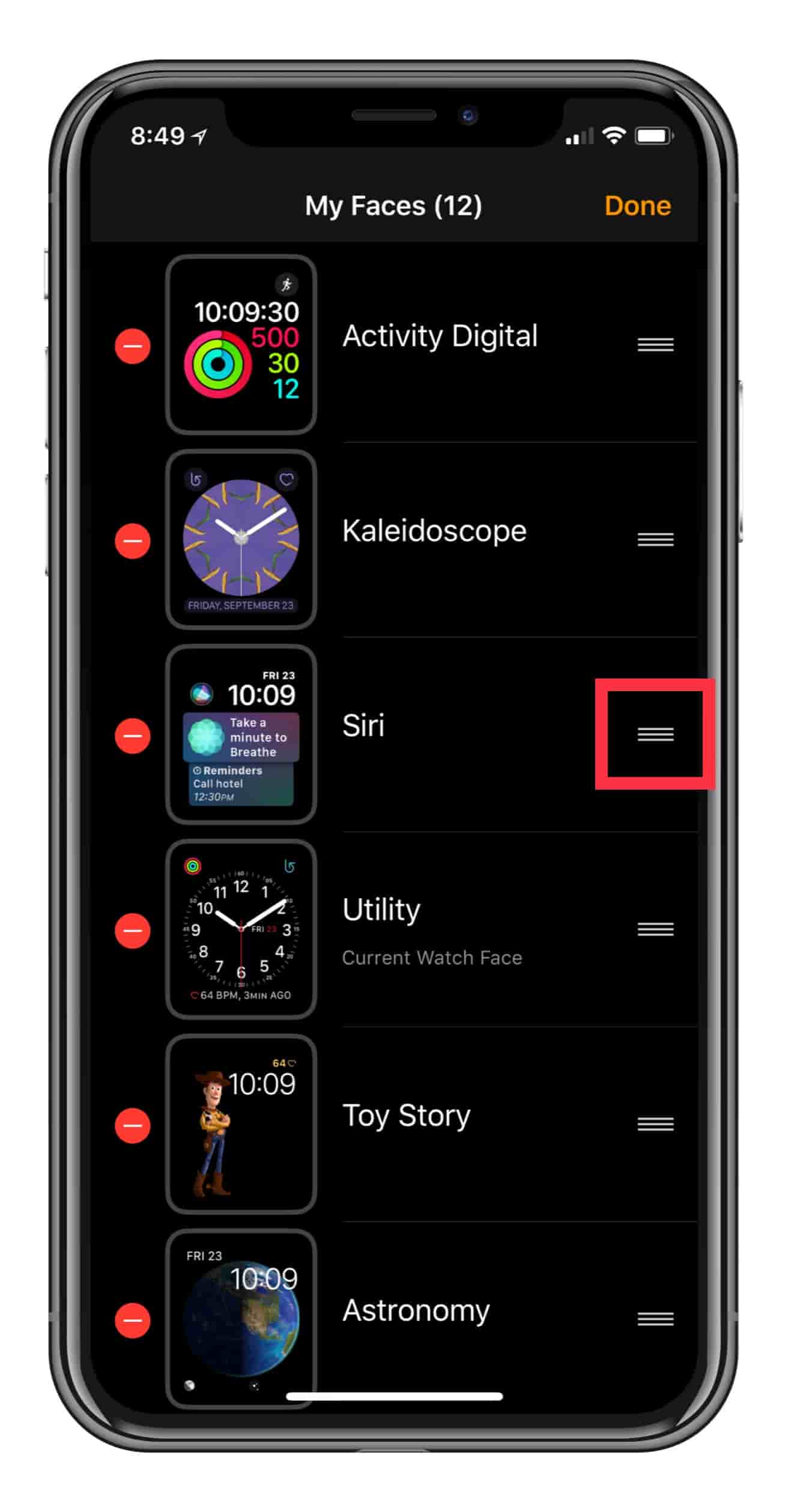 - Tap Edit, then drag the three bars icon to rearrange the order of your watch faces collection.