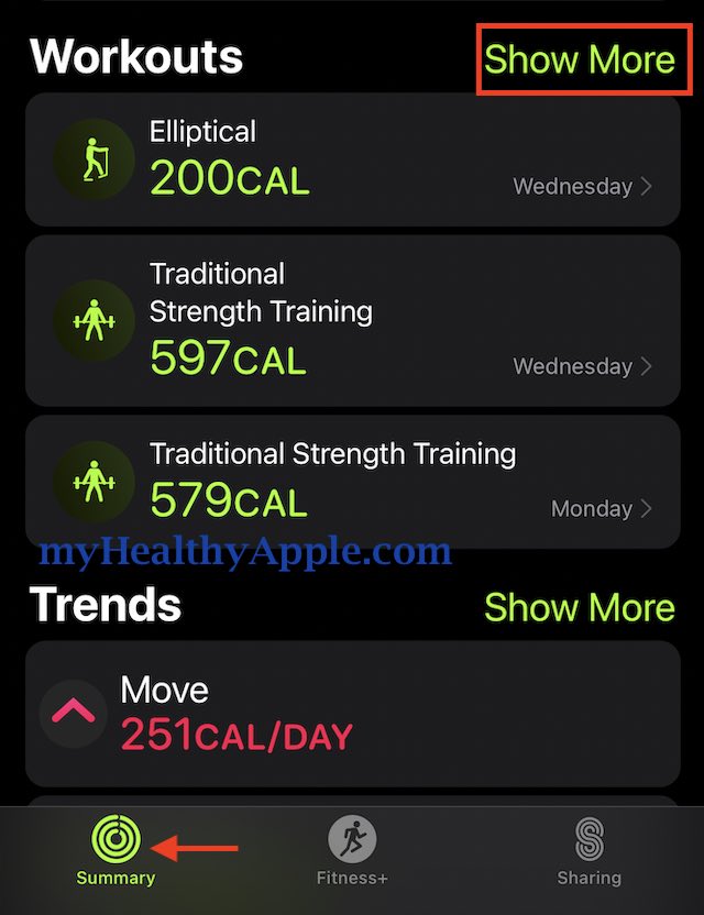 - Tap on ‘Show More’ to see additional completed workouts
