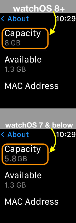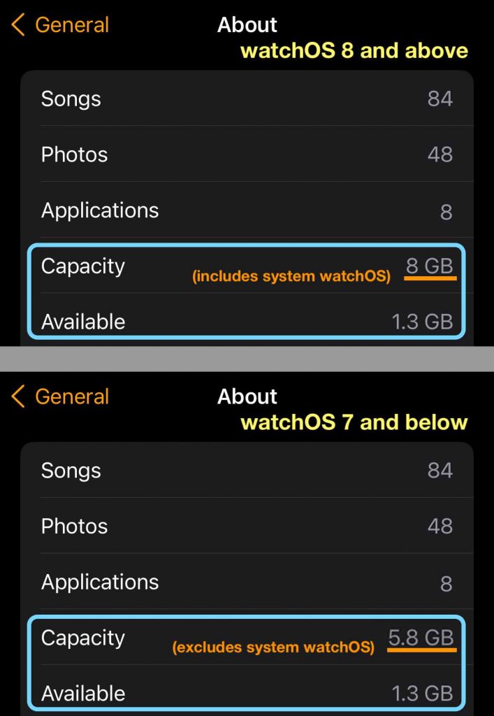 - However, starting in watchOS 8, Apple changes this, and now capacity reflects all storage, including the system partition.