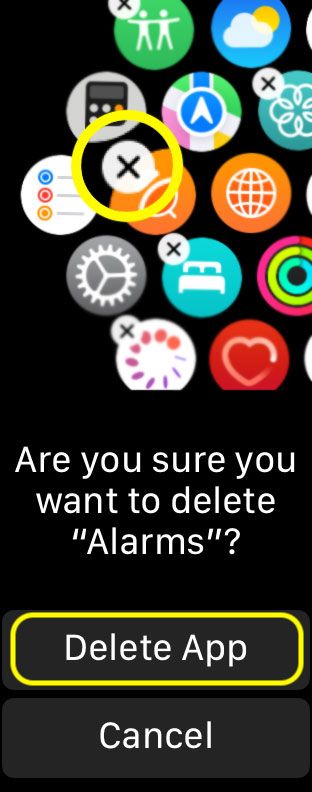 - In grid view, tap and hold an app from your watch’s home screen until the app icons jiggle. Tap the “x” delete button in the corner of the app that you want to delete, then confirm Delete App.
