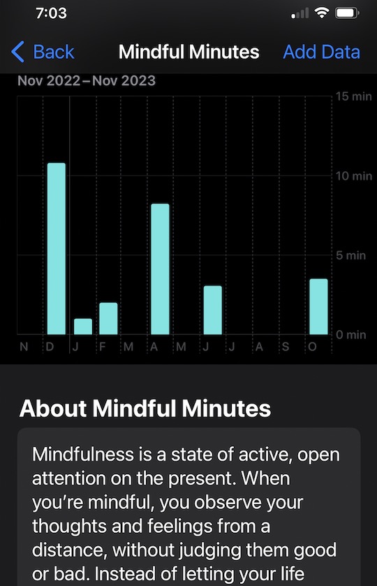 Once you have started practicing your mindfulness moments using your regularly scheduled breath reminders, you can check on the report showing the total number of mindfulness minutes in any specific period using the Health app on your iPhone.