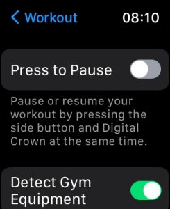 - Go back to Settings > Workouts and scroll down to Press to Pause and toggle it off.