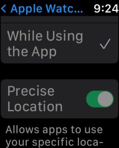 - Make sure that Apple Watch Workout app is set to either While Using or Allow Location Access.