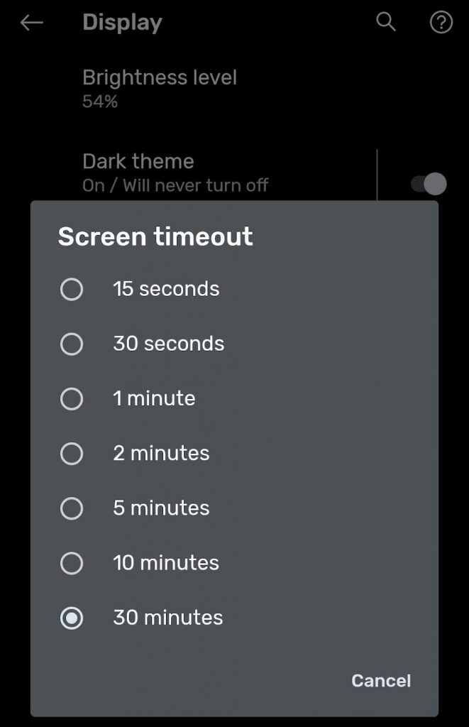 - On Android, go to Settings > Display > Avanced > Screen timeout.