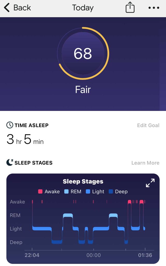 Today it said I slept for 4 hours. But when I add up the REM, light, and Deep stages as they show, it’s 4 hrs 24 min.
