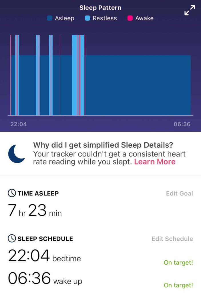 When your Fitbit cannot access consistent heart readings, or you sleep less than 3 hours, you get a sleep report that only shows the basic information–time asleep, awake, and restless.