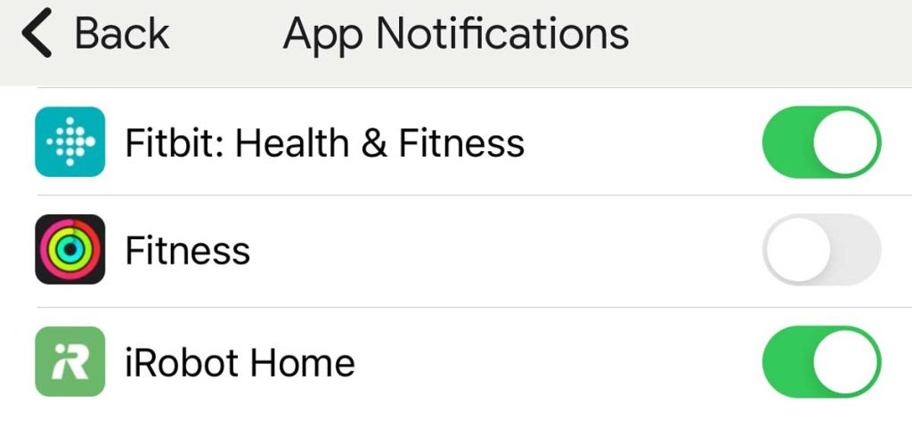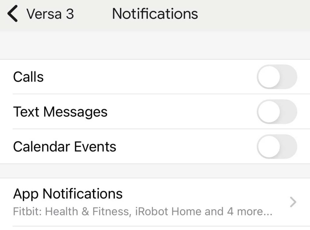 Then open the Fitbit app, choose your Fitbit device in the account options last, then scroll down and tap Notifications. Toggle everything off, wait a few moments, and toggle everything back on. Don’t forget to open App Notifications and toggle those off too, then toggle the ones you want back on.