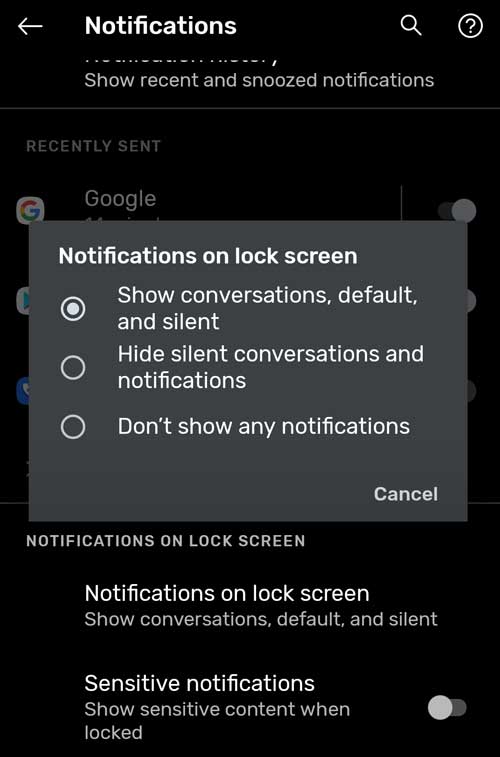 - Also, check: Settings > Apps & notifications > Notifications > Notifications on lock screen and set it to Show conversations.
