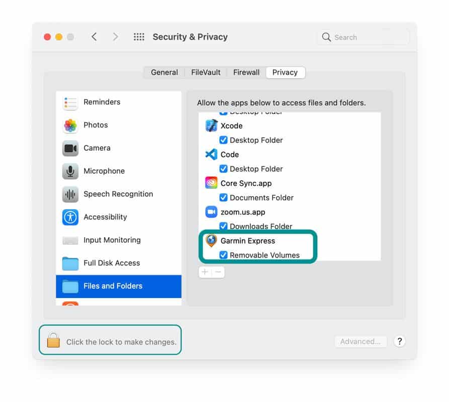 - For Macs, check your security settings in System Preferences > Security & Privacy > Privacy > Files & Folders. Checkmark removable volume underneath Garmin Express.