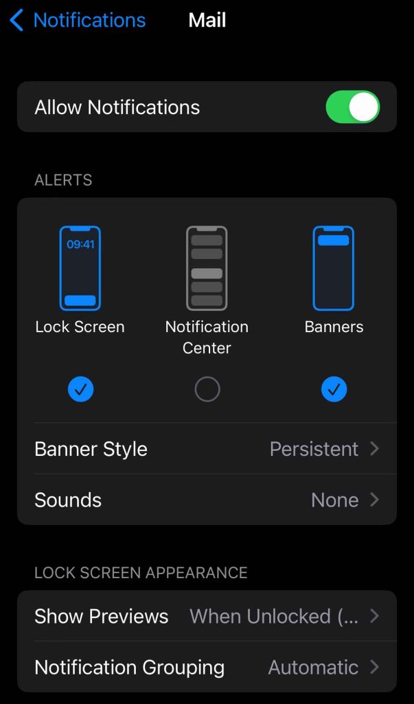 - For apps that you want notifications, set Show Previews to Always or When Unlocked and check Notification Center under Alerts.