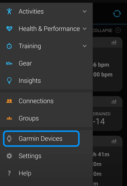 - In Garmin Connect, tap the Menu (three lines) or More (three dots) button.
