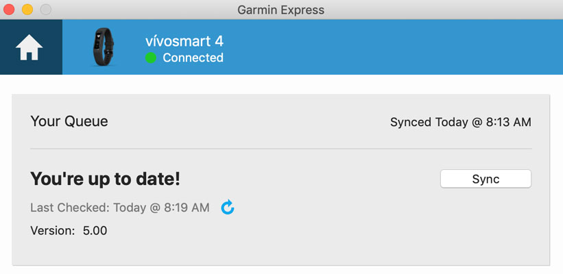 - Once your device connects and updates (if available) with Garmin Express, it automatically syncs in the background. To manually sync, press the Sync button.
