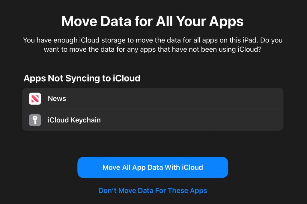 - If Apple detects you aren’t syncing apps with iCloud, it lets you know. Then, you decide if you want to move all app data with iCloud or if you don’t want to move data for those listed apps using iCloud.