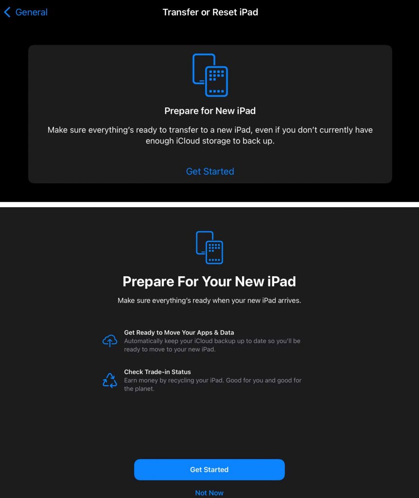 - Tap on Get Started under Prepare for New iPhone or Prepare for New iPad. If you see the message that iCloud Backup is Turned Off, tap Turn On Backup to Transfer.