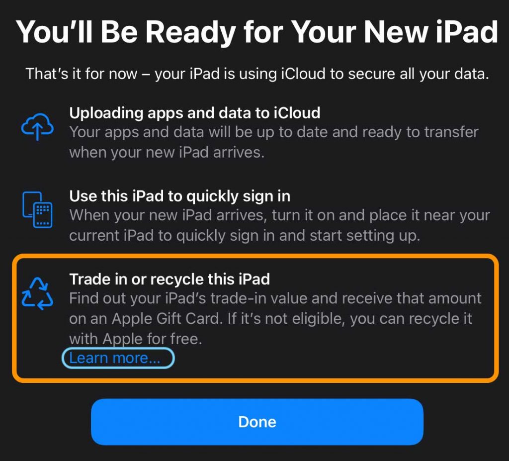 - If you want to trade in your old iPhone or iPad, tap Learn more… under Trade in or recycle this iPhone or iPad.