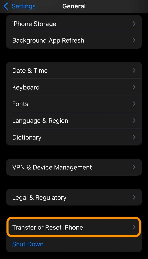 - On your current iPhone or iPad (not the new one), go to Settings > General > Transfer or Reset iPhone.