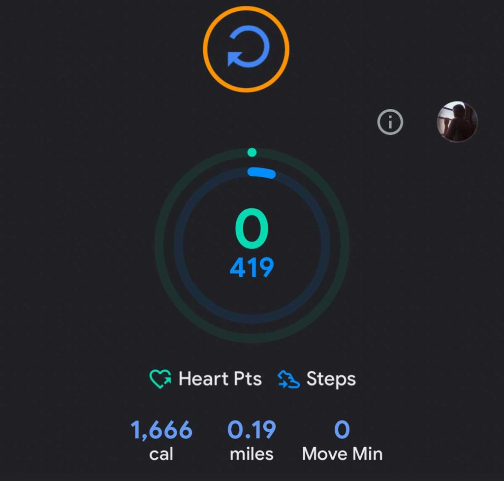 - For Apple devices like iPhones, swipe down from the top of the Heart Points graph to the middle of the screen–you should see the refresh circle.