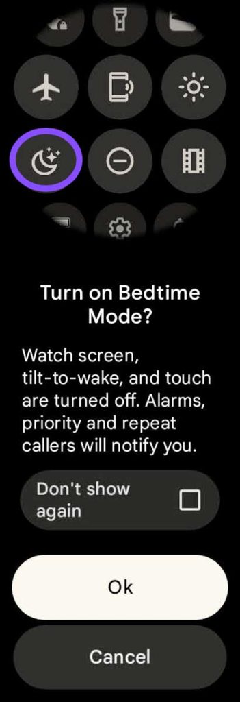 - To turn on Bedtime mode, swipe down from the watch face, and in the Quick Settings menu, tap the crescent moon icon once, then tap Ok to turn on Bedtime mode.