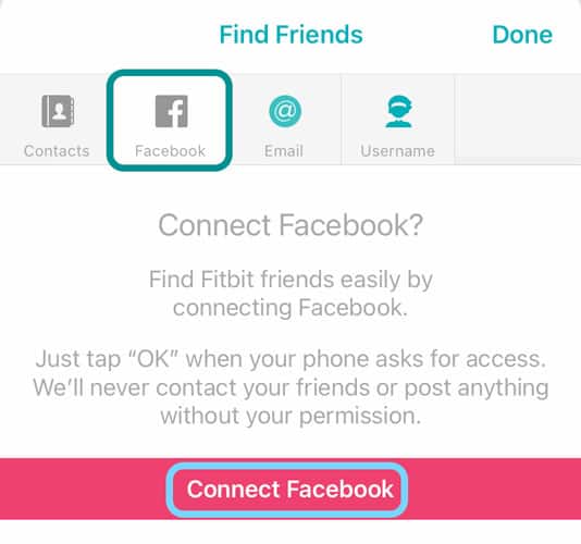 - Choose your preferred method to connect to your friends and follow the onscreen instructions. Choose from using your device’s contacts, email, or via a friend’s Fitbit username (just ask them for it!)